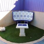 Front Patio 36m2. Car gate entrance with ample space for parking. The patio is fully tiled for low maintenance. There are mature planted areas. 2 x stone tiled seats and tables. Artificial lawn in one corner. Porch area with 2 x retractable sun shades. Power and water supplies.