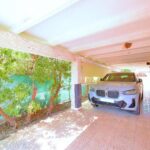 Outside, the large tiled area provides plenty of low-maintenance outdoor space, complemented by mature plants and a covered carport. Residents also benefit from access to a communal pool.