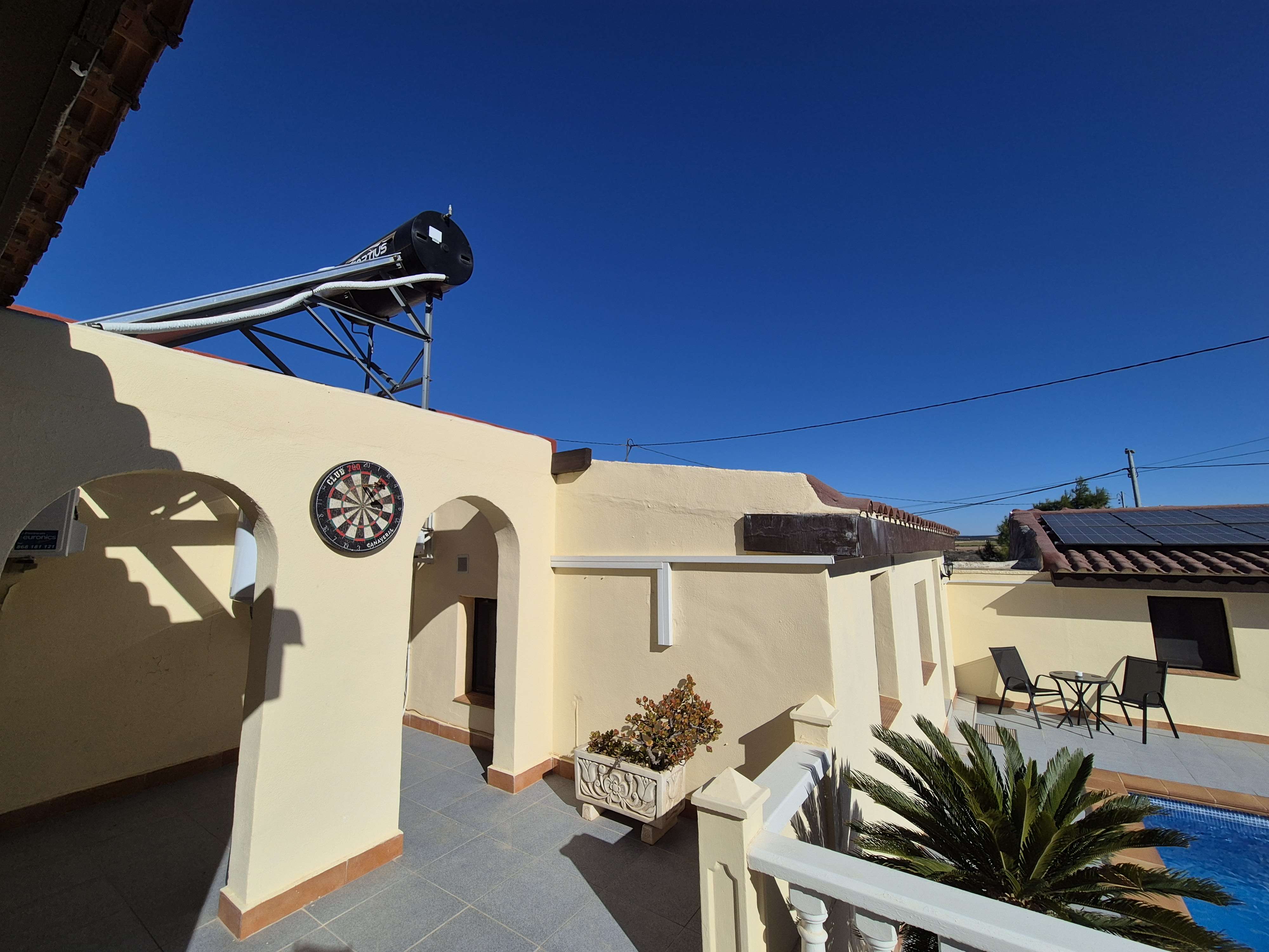 A staircase leads from the courtyard to a useful rooftop solarium with views of the village and across the countryside to the mountains beyond.
